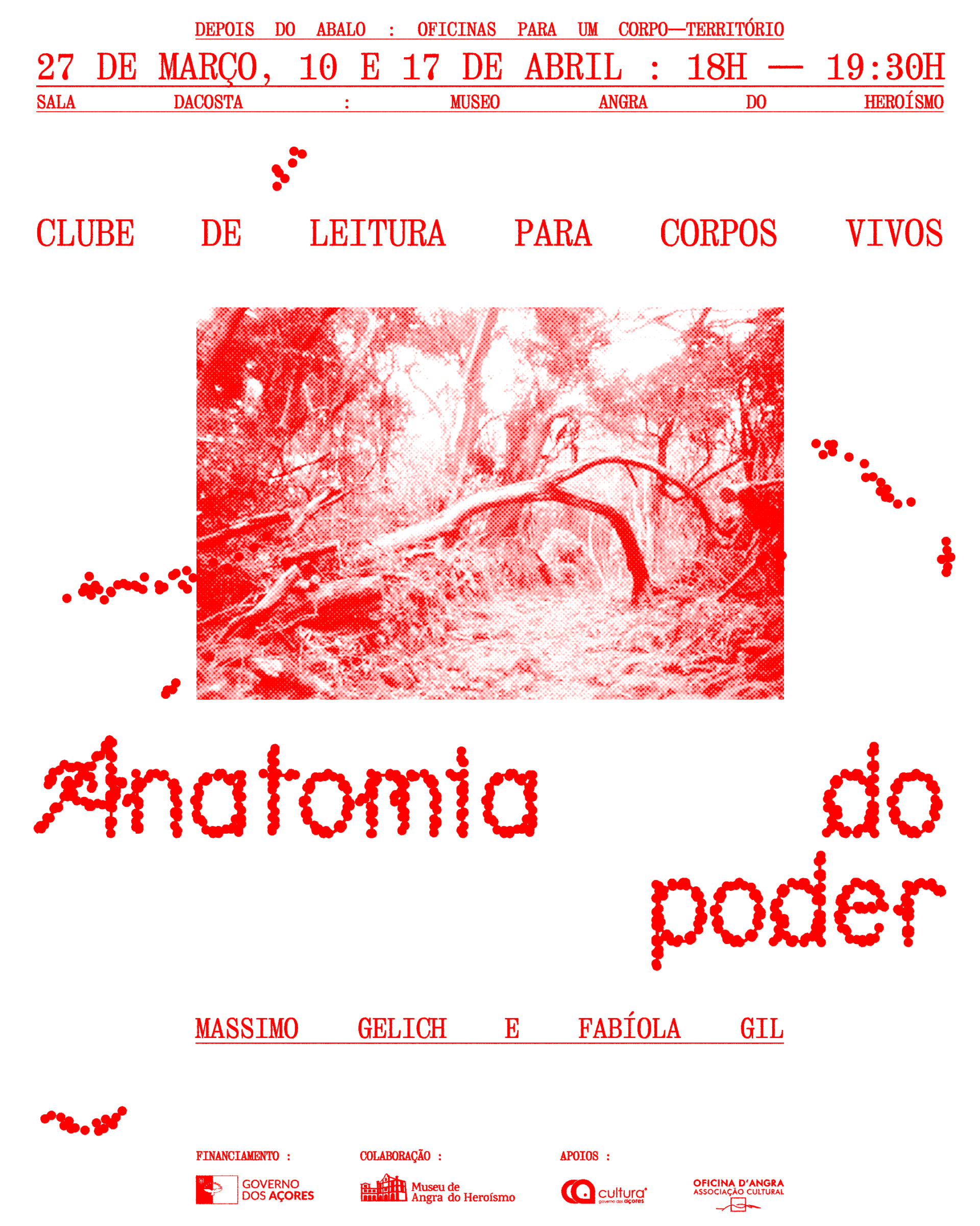 Público-alvo: adolescente e adulto. Máximo de 15 participantes por sessão. Atividade realizada no âmbito do programa pedagógico «Depois do abalo: Oficinas para um corpo-território», com curadoria de Sara Brum e o apoio financeiro do Governo dos Açores.