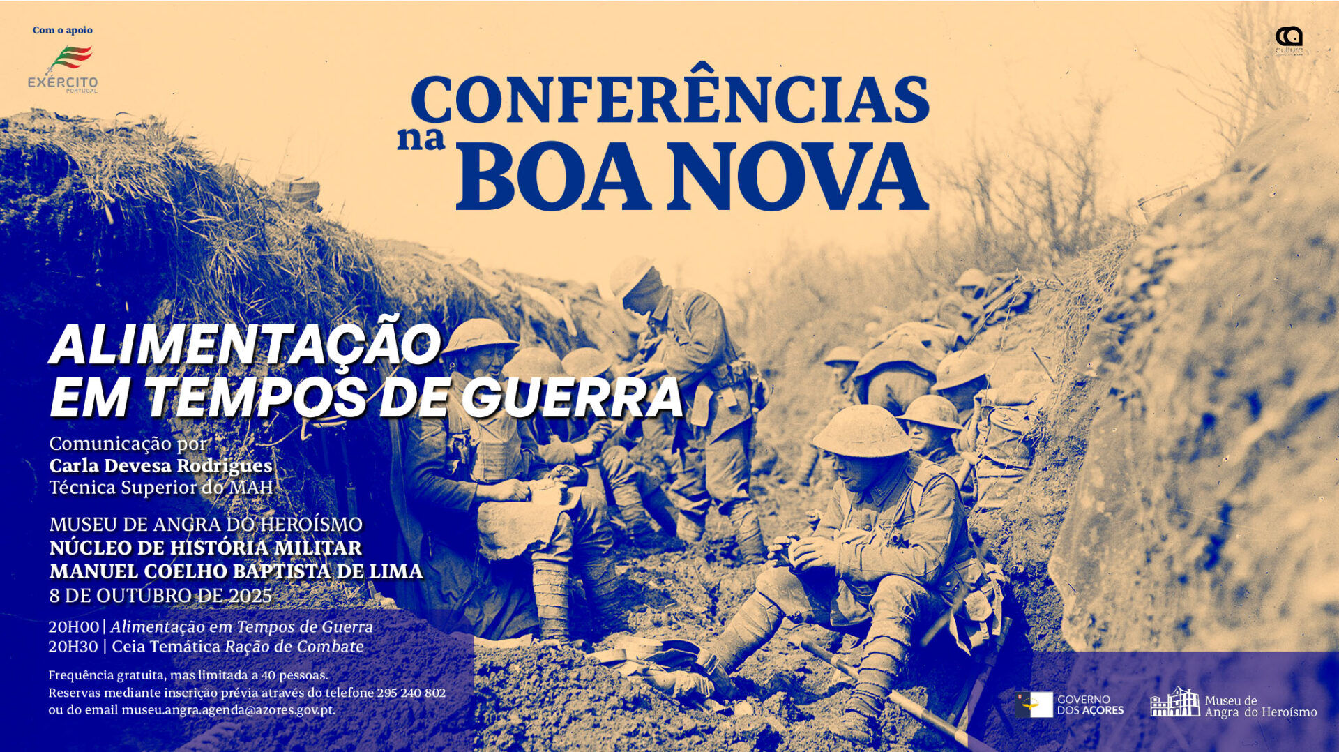 No âmbito do seu ciclo de conferências no Núcleo de História Militar, o Museu de Angra do Heroísmo promove a palestra Alimentação em Tempos de Guerra, proferida pela técnica superior do MAH, Carla Devesa Rodrigues, numa reflexão sobre como os períodos de conflito moldaram profundamente a forma como nos alimentamos, desde as práticas de sobrevivência até à evolução da indústria alimentar. Partindo do princípio de que a ingestão de alimentos ultrapassa a mera satisfação de uma necessidade biológica, a conferência explora como, em tempos de guerra, o ato de comer se transforma num exercício de resistência e adaptação. A escassez de recursos, os desafios logísticos e a urgência da conservação alimentar motivaram inovações e estratégias que perduram nas práticas contemporâneas.